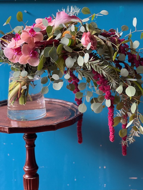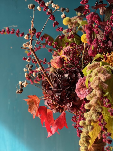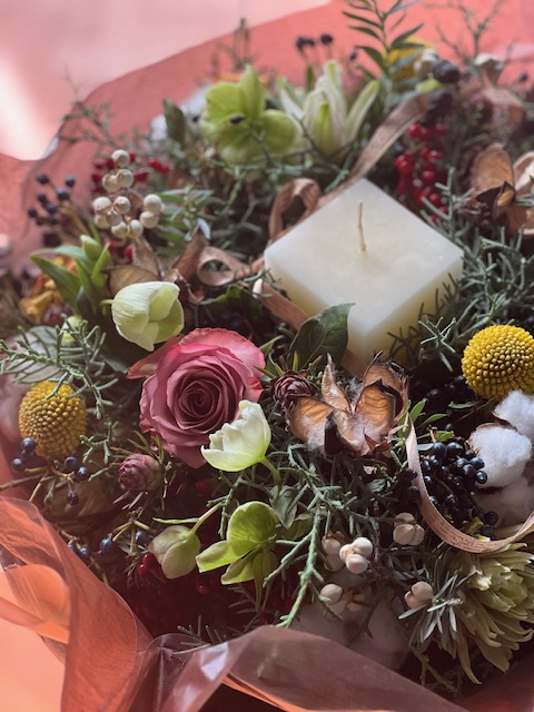 ピンクのバラやダリアを入れて